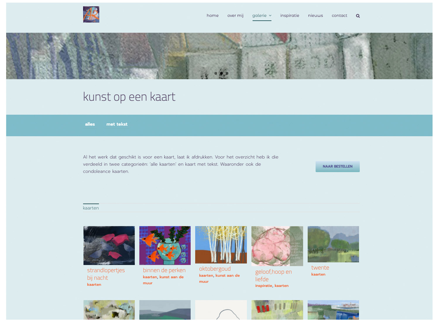 - Teken- en schilderwerk in de vorm van kaarten en groter werk, waar ook een reproductie van gemaakt kan worden. Je vindt ze in de galerie onder ‘kaarten’ en ‘kunst aan de muur’.
